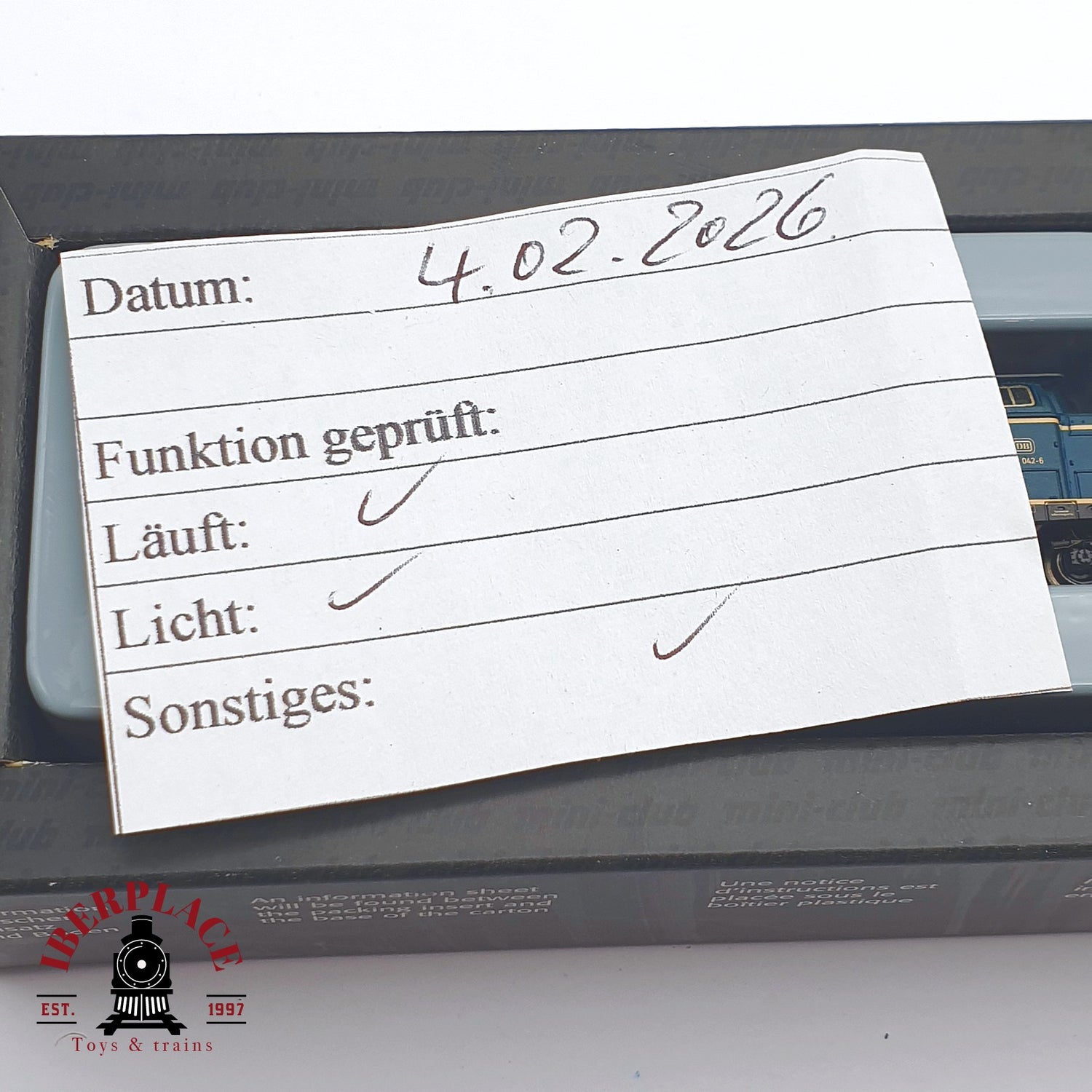 La mayoría de los artículos han sido revisados en Alemania. En algunas fotos se aprecia un pequeño comprobante/etiqueta de revisión, donde se reflejan observaciones sobre el estado, funcionamiento u otras anotaciones relevantes.