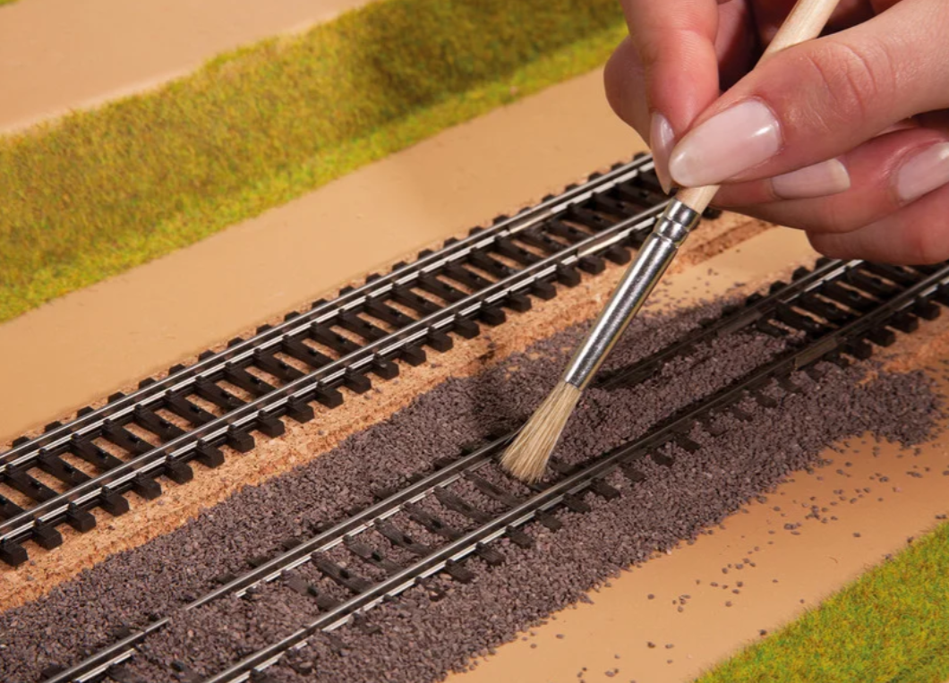El balasto y las piedras desempeñan un papel muy importante en el diseño realista de las maquetas. El balasto de las vías se suele extraer de las canteras regionales y, por tanto, refleja el color de las rocas y piedras de la región.