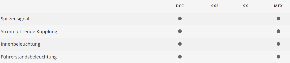 Con decodificador digital. Los faros de tres luces y las dos luces de cola rojas cambian en función del sentido de la marcha y pueden controlarse digitalmente. Iluminación interior de LED instalada de serie, conmutable digitalmente. Iluminación de la cabina de conducción conmutable digitalmente. Acoplamiento de corriente conectable digitalmente. Bajos de la carrocería de diseño específico. Luces traseras rojas transparentes en el extremo del vehículo sin cabina de conducción. Bogies pesados Minden-Deutz con frenos de doble bloque. Bogie delantero con rascador de carril, caja de cambios Sifa, Indusi y generador D 62. Radio mínimo de paso 360 mm. Para la presentación en vitrina se incluyen como piezas acoplables por separado un tubo de caída WC y una línea de control de tren reversible. Longitud sobre topes 28,2 cm.
