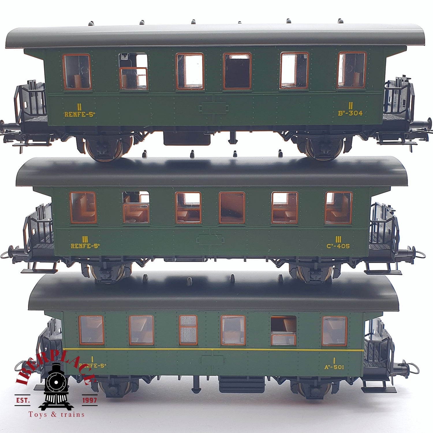 ♻️ 2 mano - Roco 3x vagones pasajero RENFE clases 1-2-3 H0 escala 1:87 AH05 is nabesteld en wordt verzonden zodra het weer op voorraad is.