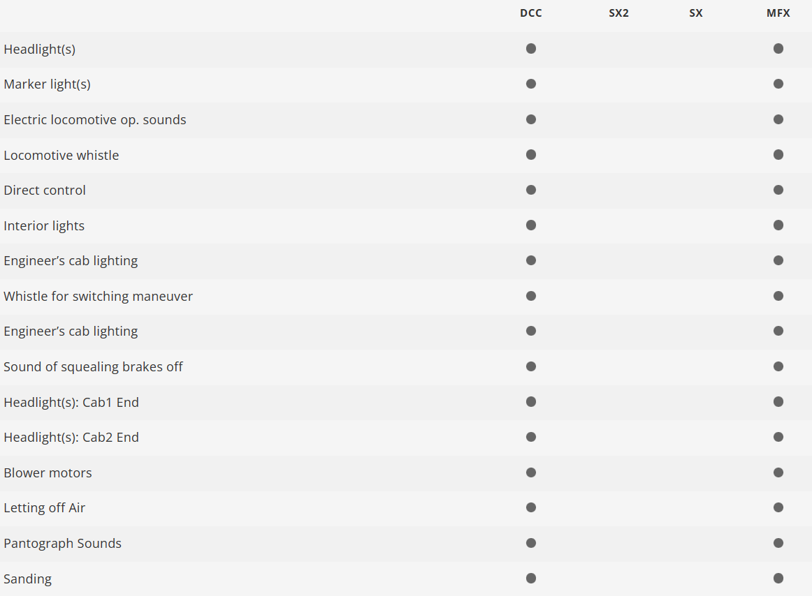Con decoder digital y numerosas funciones de luz y sonido. Accionamiento regulado de alta potencia con volante de inercia, de montaje central. Cada locomotora cuenta con tracción en ambas ruedas motrices y falso eje en ambos bogies motores a través de un árbol cardán. Aros de adherencia. Tren de rodaje articulado adaptable a las curvas. Señal de cabeza de tres luces con alternancia en función del sentido de la marcha y 1 luz de cola blanca (alternancia de luces suiza), de funcionamiento convencional, gobernables en digital. Alumbrado conmutable en marcha en solitario a 1 luz de cola roja. Señal de cabeza en extremos 2 y 1 de la locomotora, apagables cada una por separado en digital. Función de luz Doble A (de maniobras). Iluminación adicional de la cabina de conducción e iluminación de la sala de máquinas, gobernables cada una por separado en digital. Alumbrado/iluminación con LEDs blanco cálido y rojos exentos de mantenimiento. Ejecución en metal con alto grado de detalle y numerosos detalles aplicados por separado, como tubos de refrigeración para el aceite del transformador. Imitación de cabina de conducción y sala de máquinas. Con arenero en los grupos de ruedas motrices. Equipamiento de techo detallado con resistencias calefactoras, tuberías de techo, aisladores, bobinas de protección contra rayos y pasarelas de techo en madera así como pantógrafos pentagonales de arco sencillo. Radio mínimo describible 360 mm. Se adjuntan mangueras de frenos, enganches de tornillos de imitación así como escalerillas de acceso.